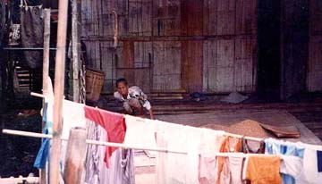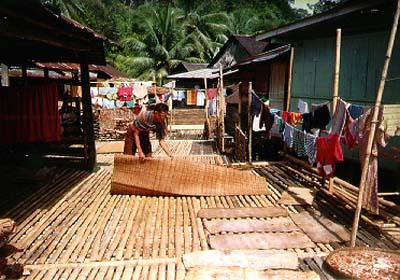 A photo of longhouse lifestyle. Picture shows a lady putting out her rice and laundry to