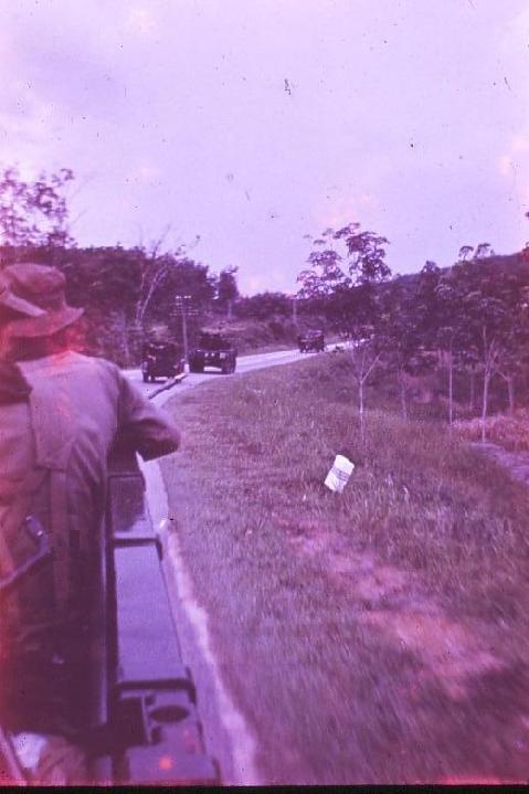 Lorries taking troops from Kuching to Serian, which became one of our main forward bases, during one tour of Sarawak. Our forward locations on this tour were Plaman Mapu, Pang Amo, Kujang Sein, and the police station at Tebedu. |