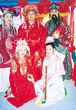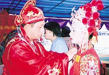 The traditional Chinese wedding ceremony performed by the Tionghua community in the Tutong district during His Majesty 57th Birthday Celebrations held in the district was an unforgettable event. The fascinating and colourful ceremony gave the spectators an opportunity to gain an insight into Chinese culture especially customary practices. There are etiquettes in the Chinese wedding like proposing, birthday matching, presenting betrothal and wedding gifts, picking auspicious wedding date and the wedding ceremony To announce a marriage in a Chinese wedding, the groom's family would provide special cakes for the bride's family to send to family and friends. Today, many Chinese bakeries in Brunei can make these cakes by special order. At dawn on the wedding day, after a bath in water infused with various grapefruits, the bride puts on new clothes and wears a pair of red shoes, waiting for the so called good luck woman to dress her hair in the style of a married woman. Her head will be covered with a red silk veil with tassels or bead strings that hang from the phoenix crown. Then she waits her future husband to escort her home, with married women talking around her how to act to be a good wife. On the other hand, the bridegroom prepares himself to receive his wife. He gets capped and dressed in a long gown, red shoes and a red silk sash with a silk ball on his chest, the groom knelt at the ancestral altar as his father put a cap decorated with cypress leaves on his head to declare his adulthood and his family responsibility. Then the bridegroom set out to receive his bride. Usually he will be crowded among his friends as escorts and musicians who play happy music all the way to radiate happiness. Dancing lions, if any, precede the troop. In the ancient time, a bridal sedan chair (or a decorated donkey due to poverty or bad traffic) would be used to serve the bride. There will be a child carrying a bridal box among the people, reflecting the bridegroom's expectation to have a child in the near future. The most interesting part of the reception really takes place at the doorstep of the bride's residence, heavily guarded by the bridesmaids or sisters of the bride. It is customary for the bridesmaid to give the bridegroom a difficult time before he is allowed to enter. Usually wisdom and courage and his friends will help the bridegroom to succeed in the quizzes. After passing the tests and singing for his bride, the bridegroom is finally allowed to meet his bride. However, there is one more pass. He has to negotiate with the bridesmaid and sisters of the bride by distributing red packets, with auspicious money enclosed, in order to take his bride home. The wedding ceremony is the hottest point. The bride and bridegroom are led to the family altar, where the couple pays kotows to Heaven and Earth, the family ancestors and parents, successively. Then they bow to each other and will be led to the bridal chamber. The ceremony proceeds under a director's prompts and applauses of the audience. Then there will be a grand feast for relatives and those who help in the wedding. The newlywed couple will resume to drink wedlock wine. Generally they are required to cross their arms to sip the wine and then exchange their cups to gulp down. They will also toast with guests to pay their thanks. Good wishes of the guests rush to the couple. However, well-intentioned people will try their best to fuddle the bridegroom who is dodging to avoid the embarrassing scene. The dominant colour of traditional Chinese wedding is red, almost every thing. Chinese tend to apply red to happy atmosphere in such big days. Chinese wedding dresses are red, a colour considered lucky since the Ming dynasty. But, in modern day, the wedding ceremony is performed in western style where the bride uses gown and the bridegroom uses vest and jacket. Traditional costumes can be rented from dress stores in Bandar Seri Begawan. The price begins at B$1,000. A simple Chinese wedding ceremony will cost about B$10,000 just for the wedding costumes, excluding other expenses like the wedding feast. The actual overall expenditure could reach B$30,000 to B$50,000, depending on how lavishly the wedding is celebrated. For the Chinese, the wedding banquet is a way to show off the riches of the host. Dish after dish of succulent meats, sea-foods, noodles and rice dishes emerge from the prominent restaurants and hotel kitchen to serve guests at the banquet. Extravagant delicacies such as bird nest soup, shark fin soup and abalone attest to the host's generosity and wealth. Foods are also served for their symbolism. Whole fish is almost always served. The word for fish, 'yu', sounds like the word for "abundance". Noodles, their length signifying long life, are also often served. Desserts that contain lotus seeds are served as a wish for the couple to have many children. Another customary practice during the traditional Chinese wedding is preparing the bridal bed. A man of good luck, usually from a nice family, will help to install the bridal bed in the right place in the bridal chamber on a selected day before the wedding day. And a woman of good luck will arrange the bridal bed and scatter candies, lotus seeds, peanuts, beans and fruits of good meanings on the bed. Nobody is allowed to touch the bed until the couple enters the bridal chamber after the wedding ceremony. Children will then be invited onto the bed to bless fertility of the couple. Usually the bride's dowry shall be sent to the bridegroom's family by the day before the wedding day. Sometimes the dowry will be brought by the bride's escorting troops on the wedding day to show off. Traditional dowry normally consists of items such as jewellery, embroidered beddings, kitchen utensils and furniture. The package of dowry is always changing except those basic items of symbol. For example, dozens years ago, sewing machine, bicycle, and recorder were musts in a marriage. Now, they are totally out of 