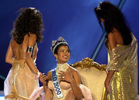 Miss India, Priyanka Chopra,18 the new Miss World, center, is congratulated by runner up Miss Italy Giorgia Palmas, 18, left, and Miss Turkey Yuksel Ak, 20, at London's Millennium Dome Thursday Nov. 30, 2000. (AP Photo/Adam Butler) PHOTO: 1 2 3 4 5 6 7 8 9 10 11 12 |