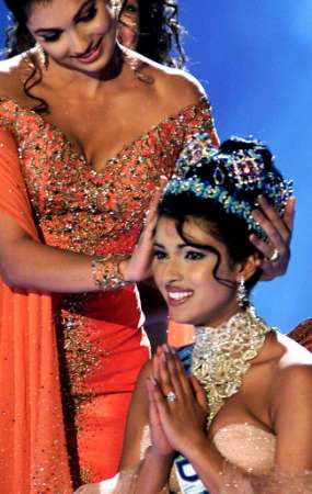 Miss India, Priyanka Chopra (R) is crowned by Miss World 1999 Yukta Mookhey after winning the Miss World 2000 contest at the Millennium Dome in London, November 30, 2000. Ninety-five girls from various different countries around the world competed for the coveted title of Miss World, as the contest celebrates its 50th anniversary. REUTERS/Jonathan Evans PHOTO: 1 2 3 4 5 6 7 8 9 10 11 12 |